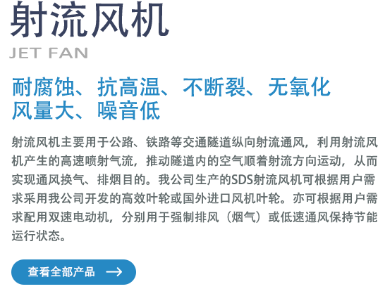 成功研發(fā)和引進(jìn)了SDF型隧道節(jié)能風(fēng)機(jī)和SDS型隧道射流風(fēng)機(jī),有超長的送風(fēng)距離、良好的節(jié)能效果。
